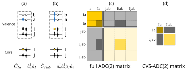 One way to reach the space of core-excitations (and thus be able to compute, for example, X-ray absorption spectra), without having to deal with an intractably large ADC matrix is provided by the core-valence separation (CVS) approximation. CVS is obtained by decoupling the core and valence excitation spaces and is motivated by the large energy separation between them Cederbaum et al. (1980). Essentially, it consists of applying only excitation operators that involve one core electron -- see (a) and (b) in below figure. This translates into keeping only those blocks of the ADC matrix which include one core orbital (c) and significantly reduces the size of the matrix to be diagonalized (d). The error introduced by this approximation is small and system independent Herbst & Fransson (2020).
