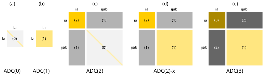 The structure of the ADC(n) matrix at different orders n is illustrated below. The numbers indicate the orders of perturbation theory used to expand