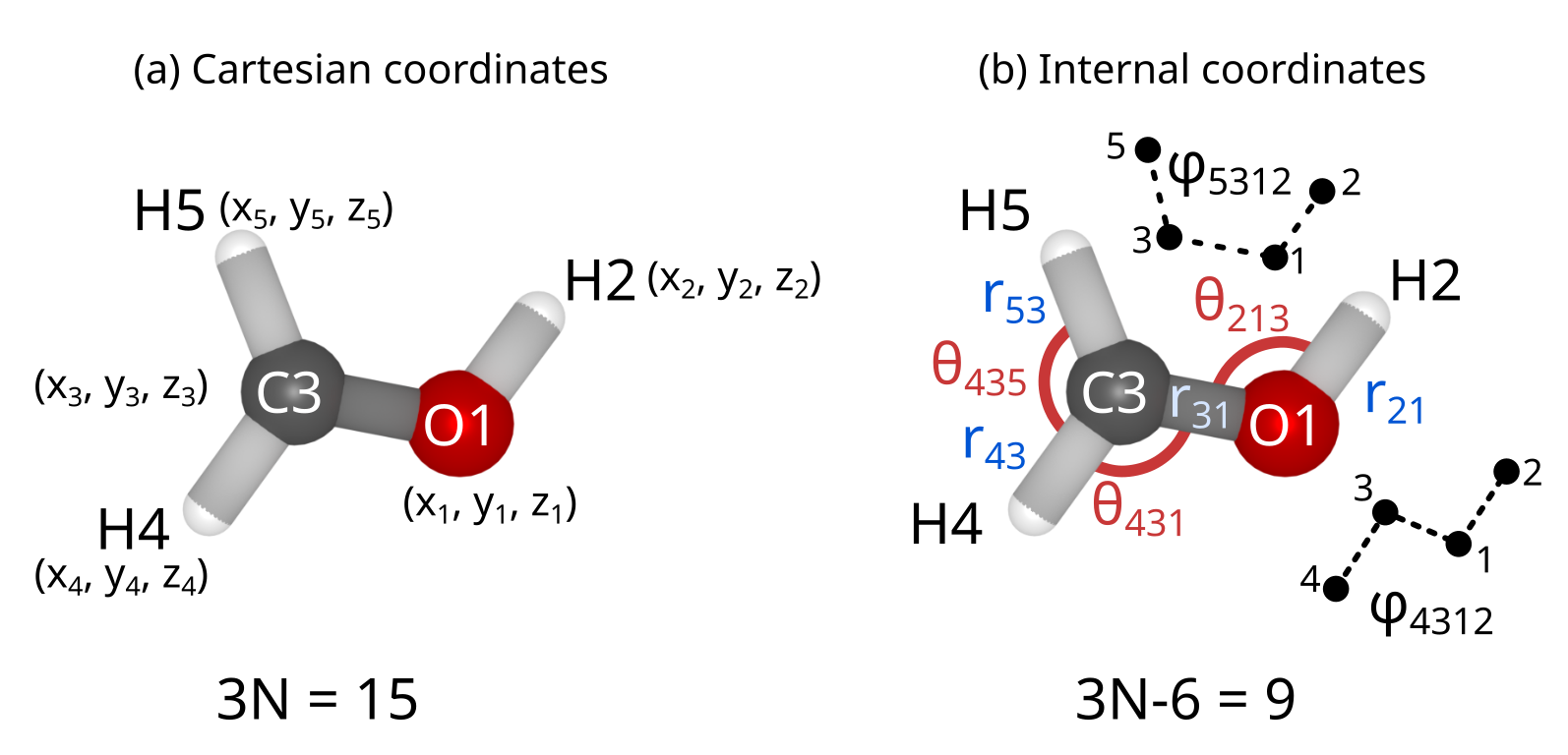 A more favorable choice is to work with internal coordinates, such as bond lengths, valence angles and dihedrals. The most well known set of internal coordinates is the Z-matrix, which uses this properties in order to describe the molecular structure. However, using internal coordinates poses two challenges: (1) the choice of coordinates is not unique, and (2) internal coordinates have to be transformed back into Cartesian coordinates to compute the energy and gradient. Several ways of handling these problems are discussed below.