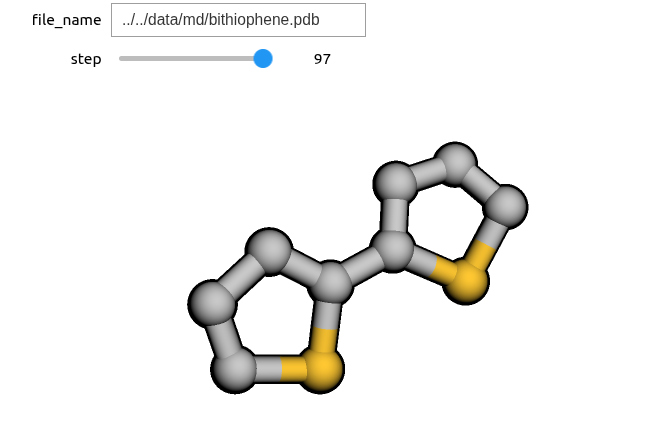 viewer.show()Now we can create a widget with a slider that allows us to visualize one configuration at a time. To do so, we make use of the ipywidgets module which allows to interactively change the parameters of a Python routine. In our case, we use ipywidgets to allow the user to set the trajectory file name and step index required by the return_viewer routine which generates the py3Dmol viewer. The step is set using a slider widget which allows the user to select any value between the defined limits (note that the slider only works in a Jupyter notebook).