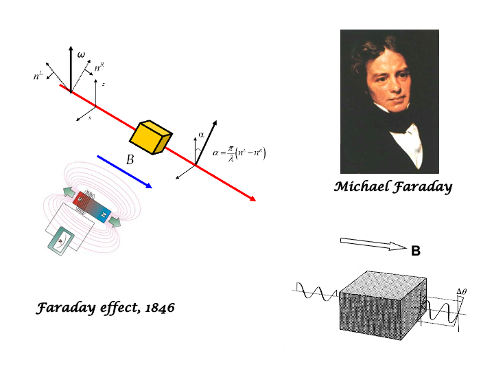 Observed in 1846, the Faraday effect is the rotation of the plane of polarization of a linearly polarized light beam traversing a transparent sample (glass, liquid, gas) occurring when a static magnetic field is applied with its direction parallel to that of propagating beam. Historically it was the first ever experimental evidence of a double refraction (birefringence) phenomenon, and in particular of a circular birefringence. It takes its name from the discoverer and it is also known an magnetic field induced-optical rotation. The rotation is proportional to the optical anisotropy, which depends linearly on the strength of the applied magnetic induction field. The mechanisms governing this effect involve the interaction of the static external magnetic induction field with the oscillating electric field of the light wave and with the electric multipoles of the sample. The term magnetic optical rotatory dispersion (MORD) is often used to denote the frequency dispersion of the Faraday effect, and thus of the corresponding circular birefringence.