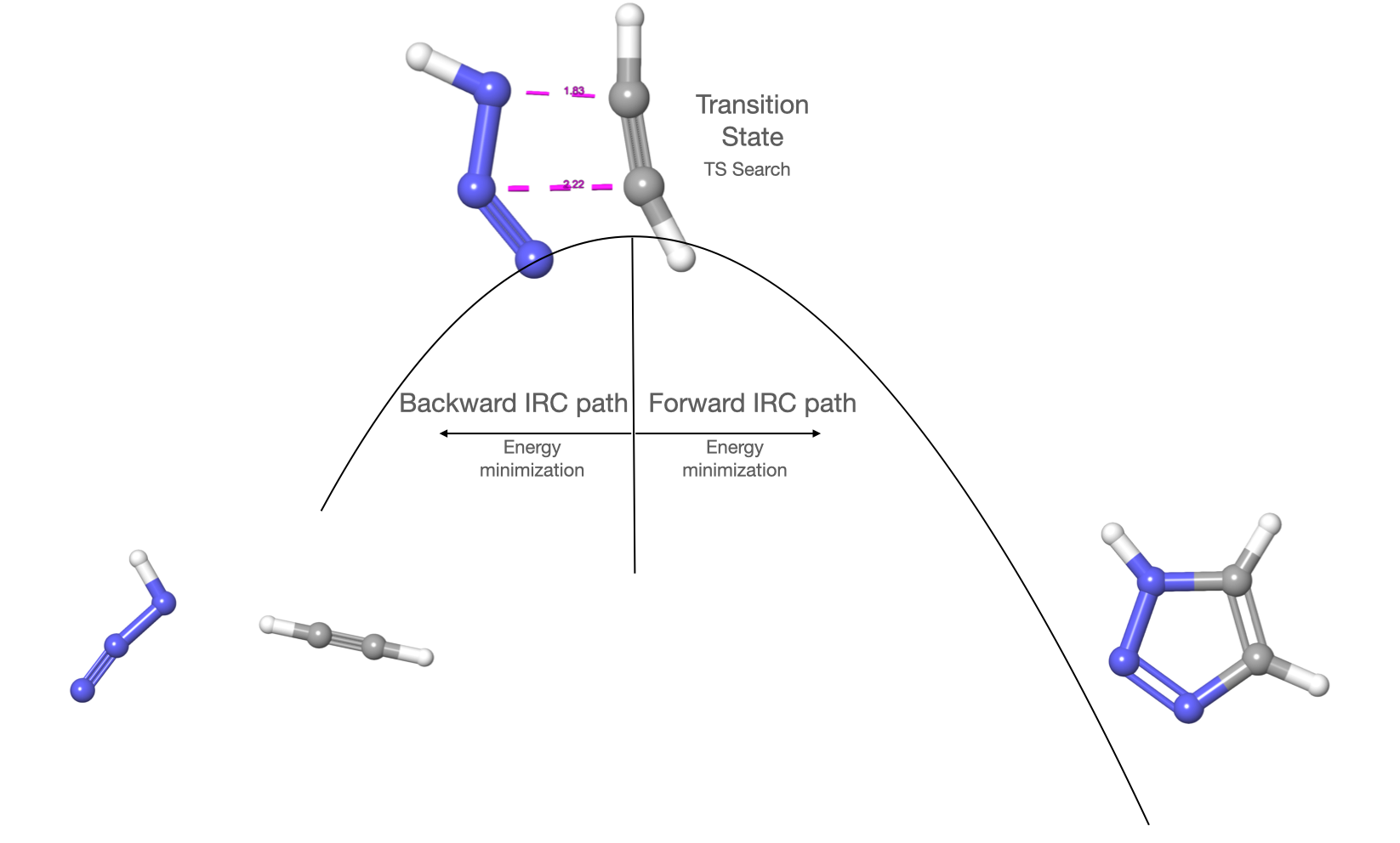 To ilustrate the concepts we will use a simple example in which we will perform the Intrinsic Reaction Coordinate (IRC) method. So, we will start with a transition state candidate and optimize it to transition state. Then we will just minimize the energy in the backward path and the forward path to obtain the reactant and the product as illustrated in the following figure: