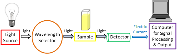 A spectrophotometer is made with a light source, which passes first though a monochromator and/or through various types of filters, used to separate light keeping only photons within a narrow selection of wavelengths. Then the light beam passes through to the sample, where it is partly absorbed. Often after the monocromator the original beam is split (using appropriate setups) so that part of the light might go through the sample of interest, and the other through the reference sample. The beam(s) then hit a detector (a photomultiplyer tube, or a photodiode) which converts light into readable electronic signals.